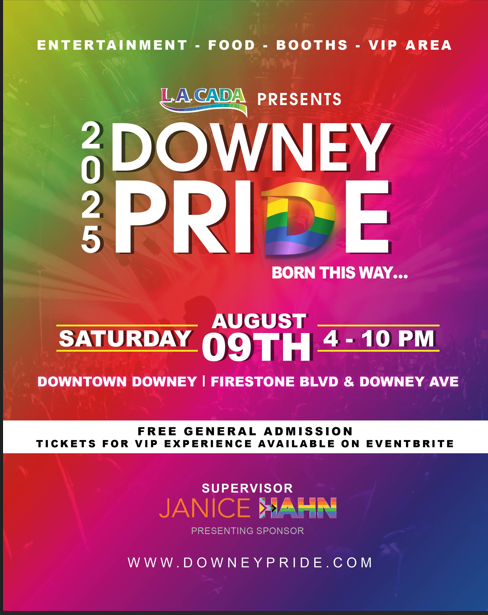 Downey Pride 2025 will take place on Saturday, August 9, 2025, from 4:00 PM to 10:00 PM, in the heart of Downtown Downey at Firestone Boulevard and Downey Avenue. This vibrant festival promises a fun-filled evening featuring live entertainment, local food vendors, community booths, a designated VIP area, and plenty of family-friendly activities. With free general admission and VIP experience tickets available on Eventbrite, this celebration is open to everyone who believes in the power of community, visibility, and love. Presented by L.A. CADA and proudly supported by Supervisor Janice Hahn as the presenting sponsor, Downey Pride 2025 invites you to stand with us in solidarity, celebration, and joy. For more information, updates, and ways to get involved, visit www.DowneyPride.com.